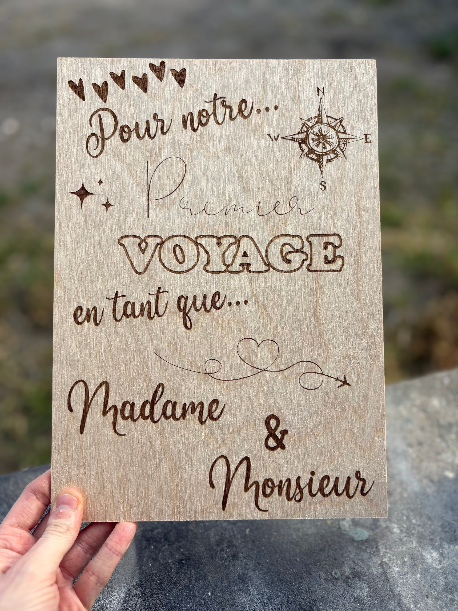 Affiche en bois au format A4, gravée avec finesse pour célébrer votre premier voyage de couple. Son bois naturel, avec ses teintes chaleureuses et son grain authentique, apporte une touche élégante et romantique à cet espace dédié.