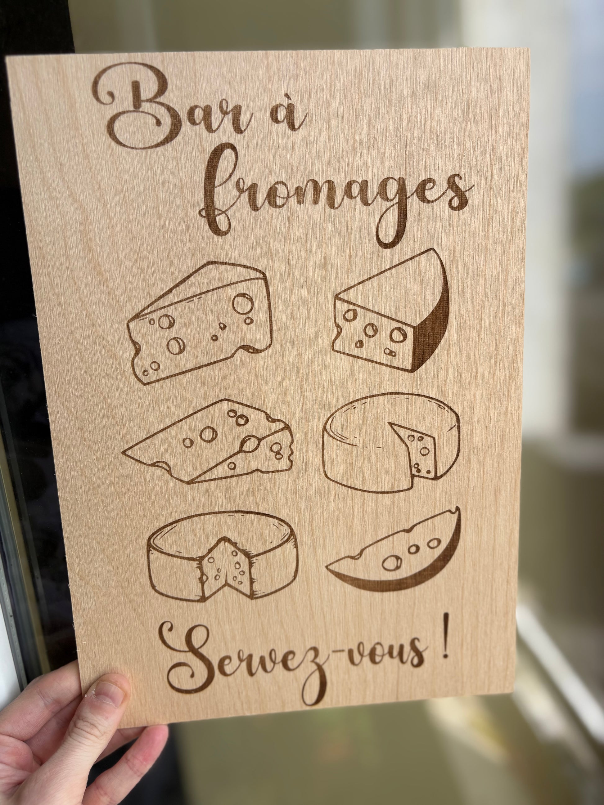 Affiche en bois au format A4, gravée avec finesse pour mettre en valeur votre bar à fromage. Son bois naturel, avec ses textures et nuances chaleureuses, s’intègre parfaitement à l’atmosphère conviviale et gourmande de votre événement.