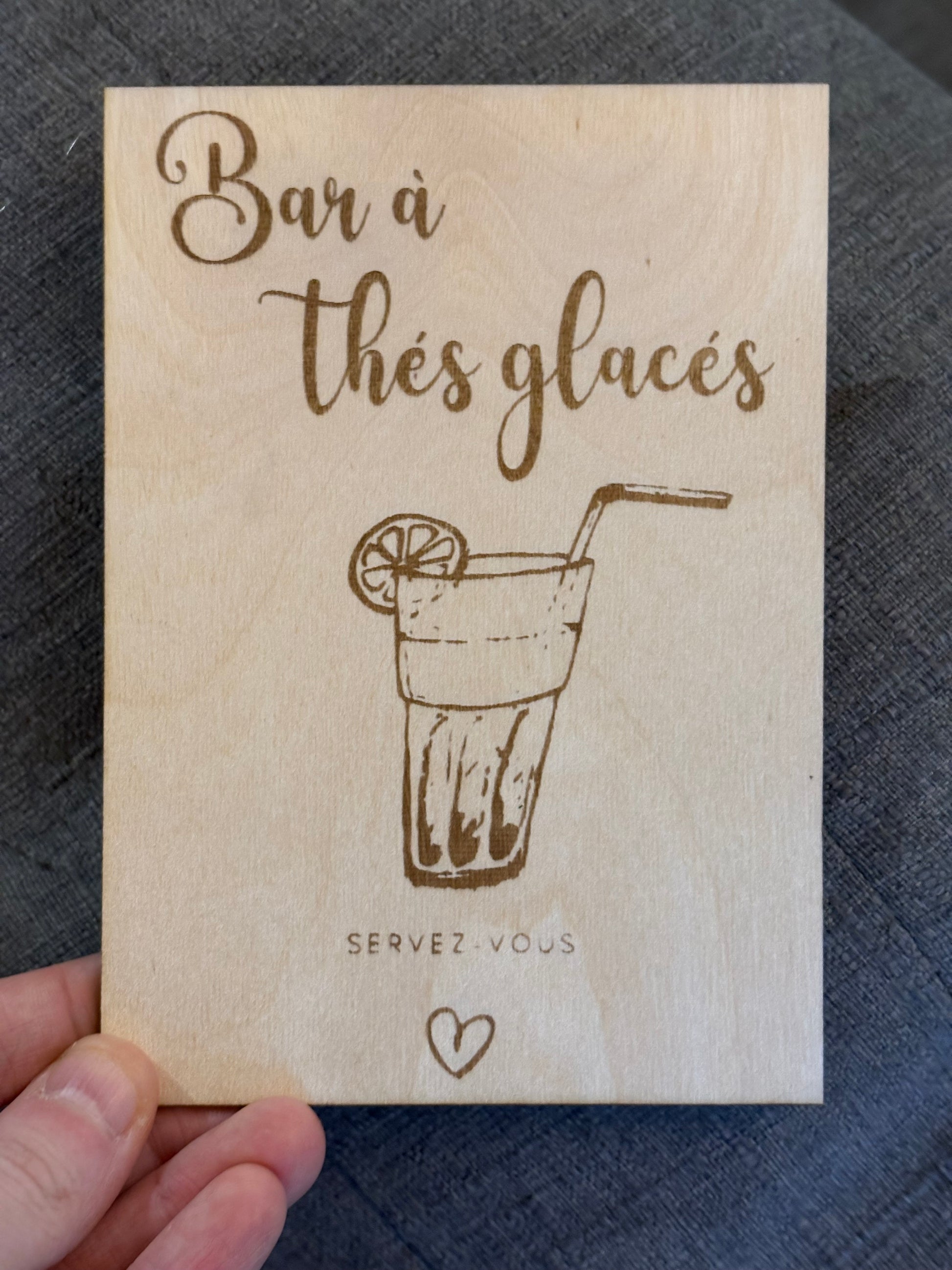 Affiche en bois au format A6, gravée avec soin pour inviter vos convives à savourer un délicieux thé glacé. Son bois naturel, aux nuances chaleureuses et authentiques, apporte une touche élégante et rafraîchissante à votre espace de dégustation.