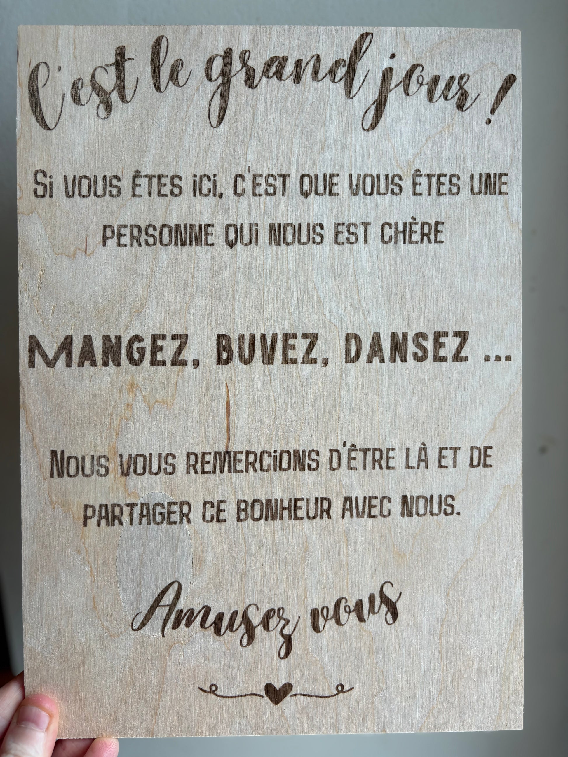 Affiche en bois au format A4, gravée avec soin pour accueillir chaleureusement vos invités dès leur arrivée. Le bois, avec sa texture naturelle et ses nuances authentiques, apporte une touche d’élégance et de convivialité, parfaitement adaptée à l’ambiance de votre événement.