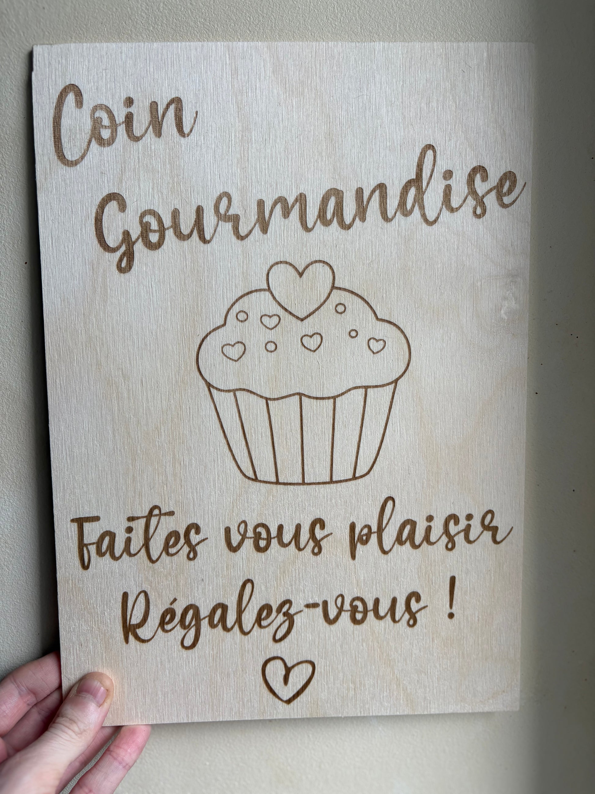 Affiche en bois au format A4, gravée avec soin pour guider vos invités vers les petites douceurs mises à leur disposition. Son bois naturel, avec ses nuances chaleureuses et son grain subtil, apporte une touche raffinée et gourmande à votre événement.
