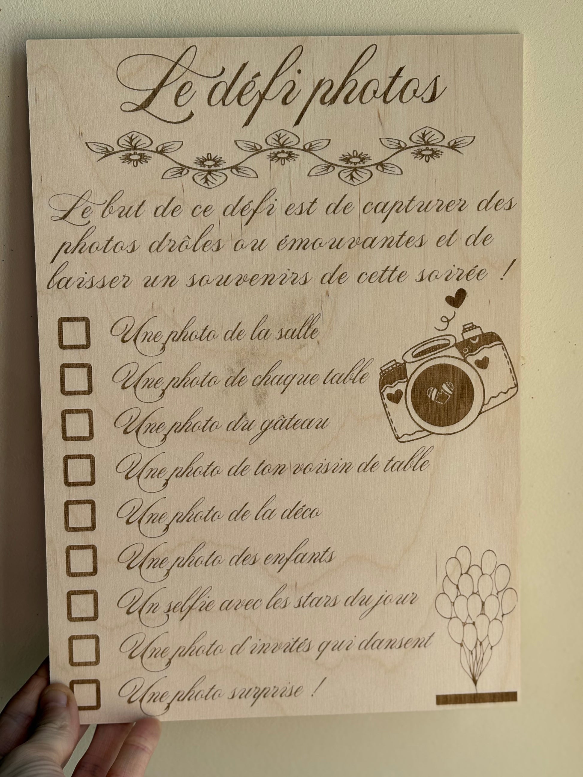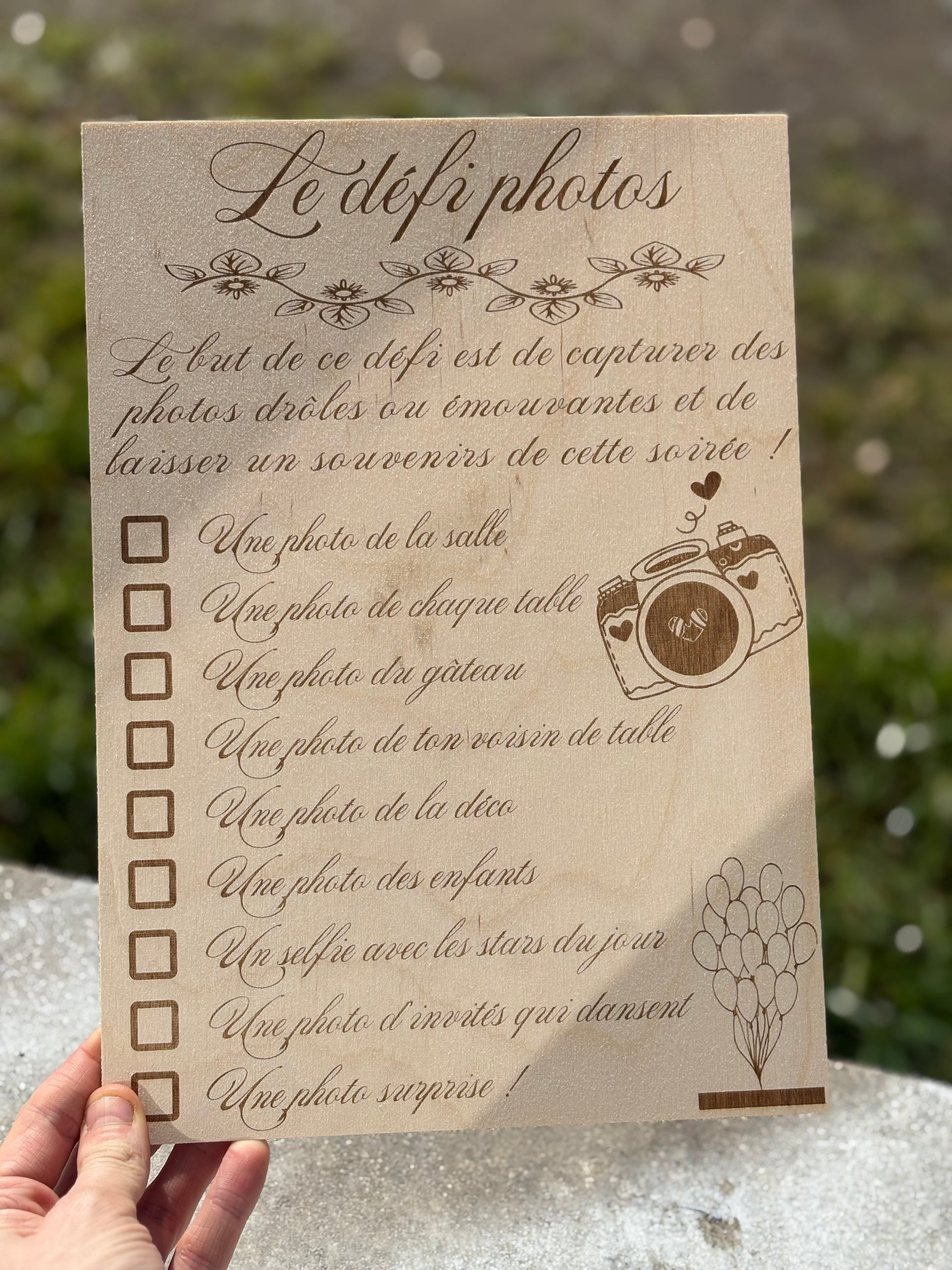 Le message gravé, dynamique et engageant, invite vos convives à relever un défi photo amusant, les encourageant à capturer des moments uniques de votre journée.