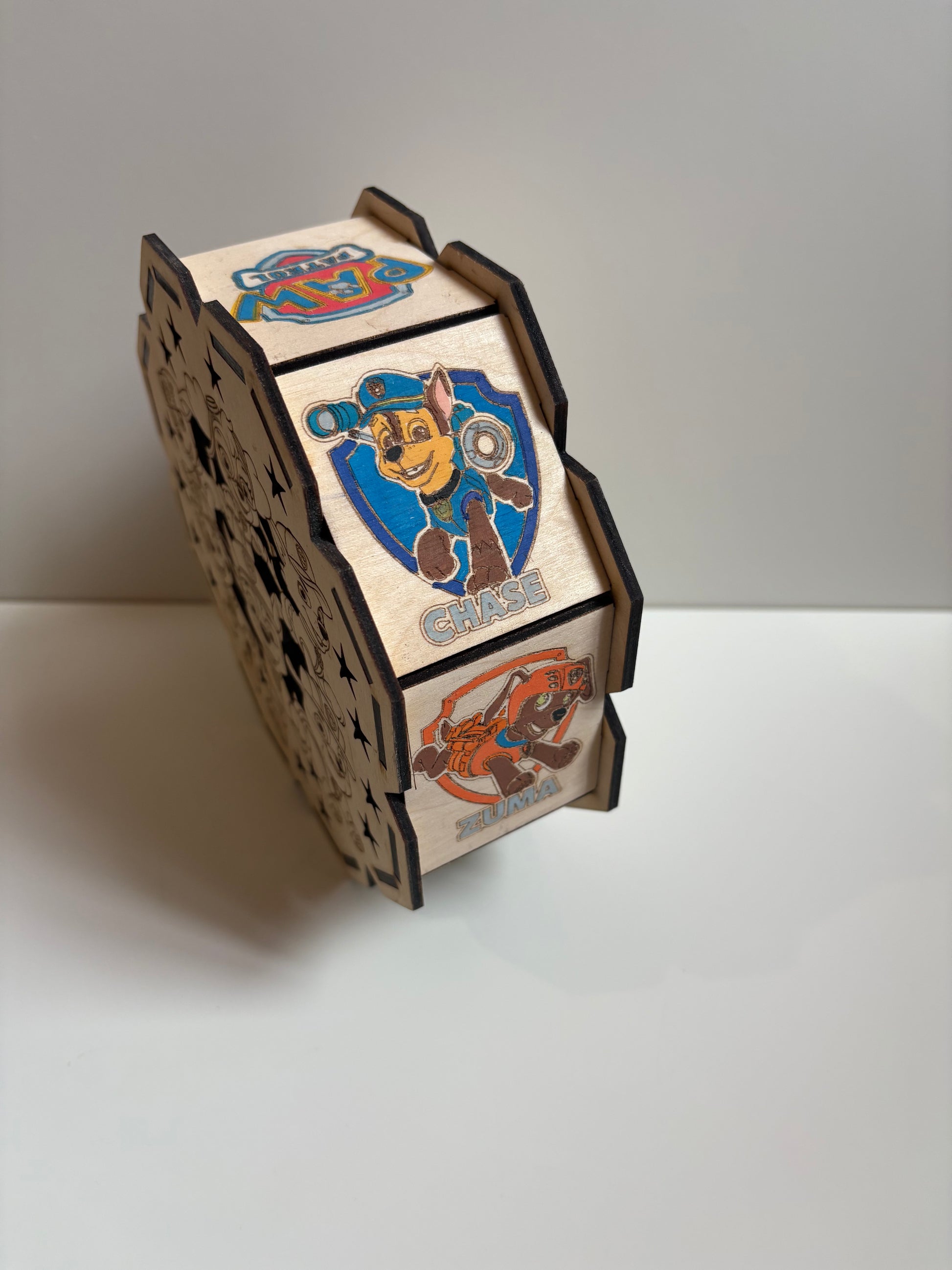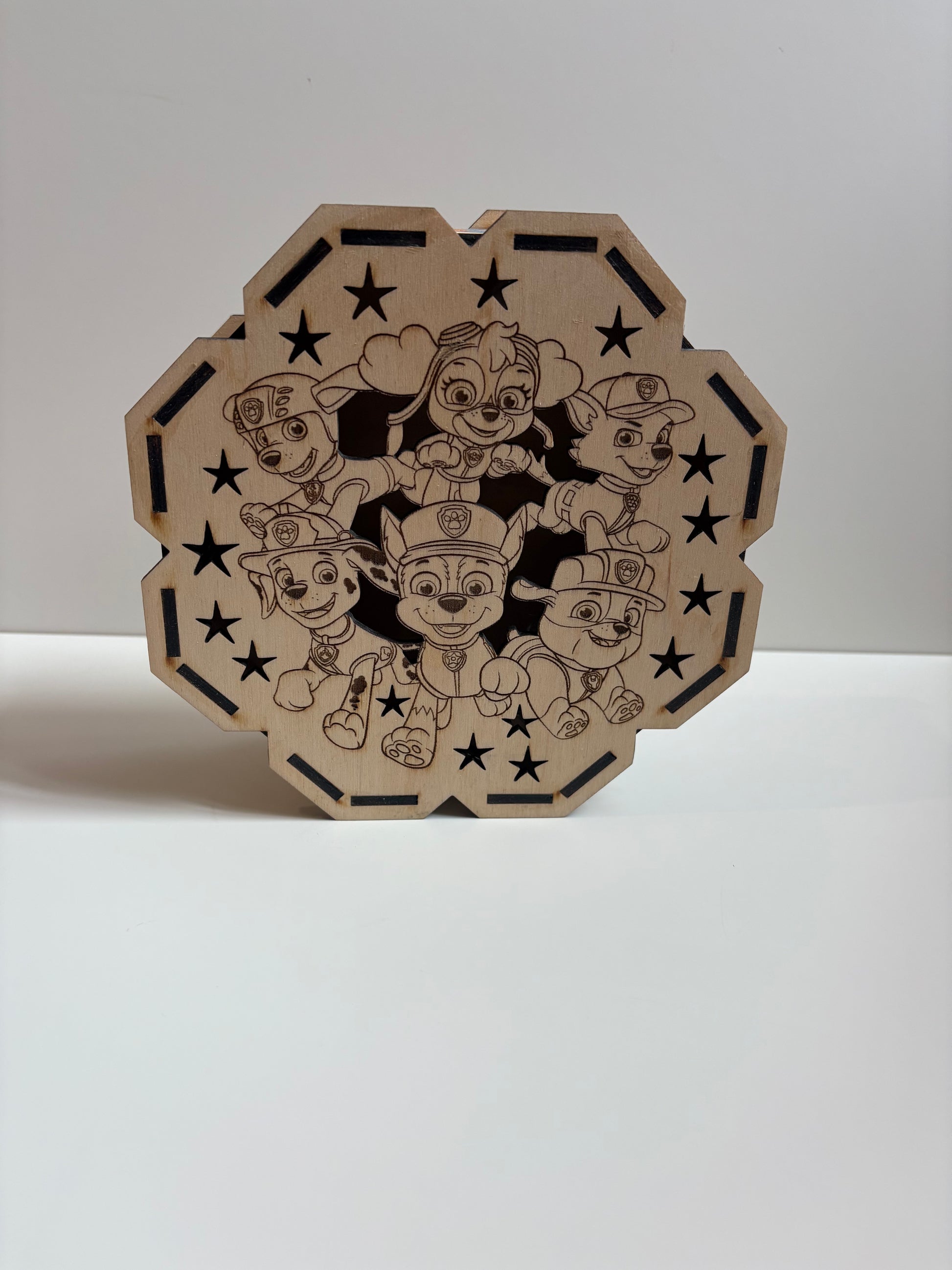 Superbe lampe en bois de 16 cm de diamètre, inspirée de l’univers dynamique et plein d’aventure de *Pat Patrouille*.