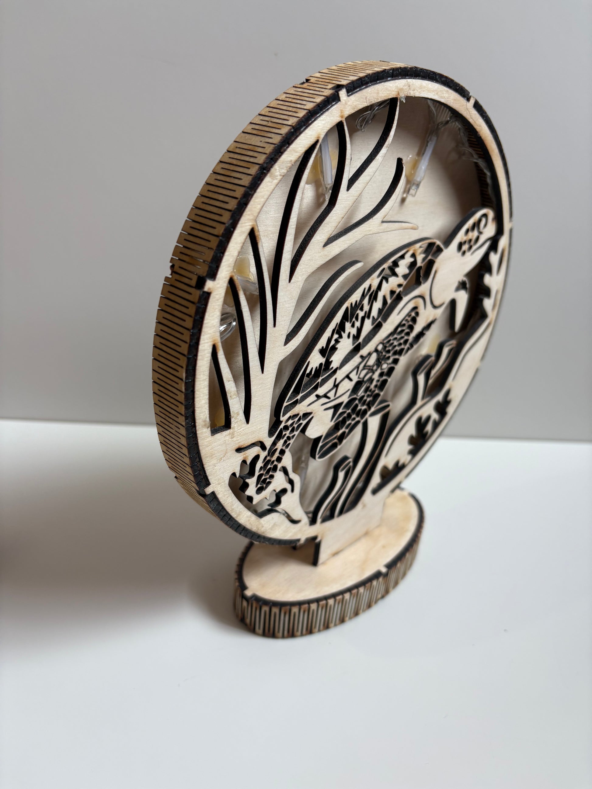 Magnifique lampe en bois, inspirée du thème des tortues, aux dimensions de 17 cm de diamètre et 20 cm de hauteur.