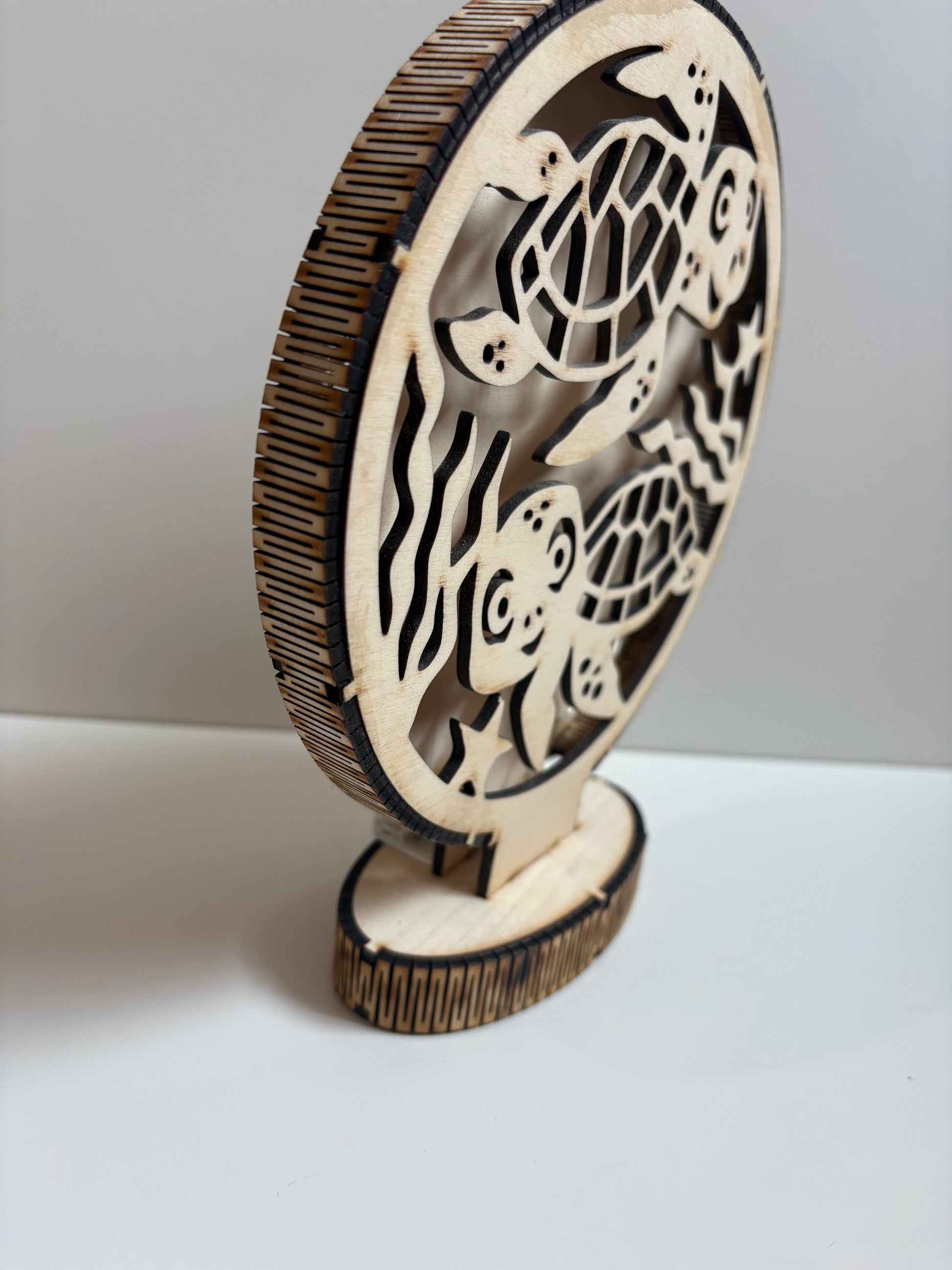 Imagine une magnifique lampe en bois, inspirée du thème des tortues, aux dimensions de 17 cm de diamètre et 20 cm de hauteur.