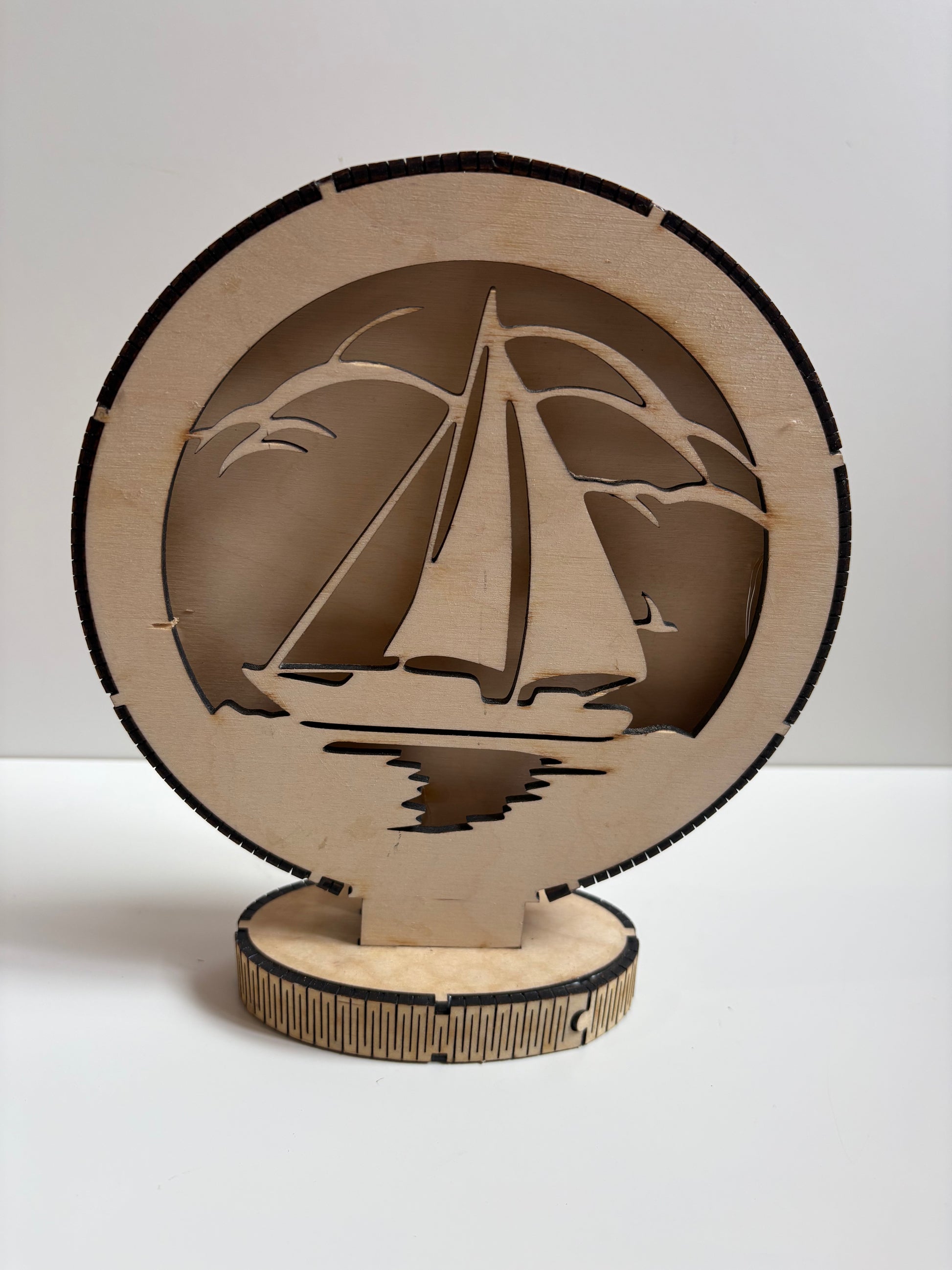 SUber e lampe en bois, inspirée du thème des voiliers, mesurant 16 cm de diamètre et 20 cm de hauteur.