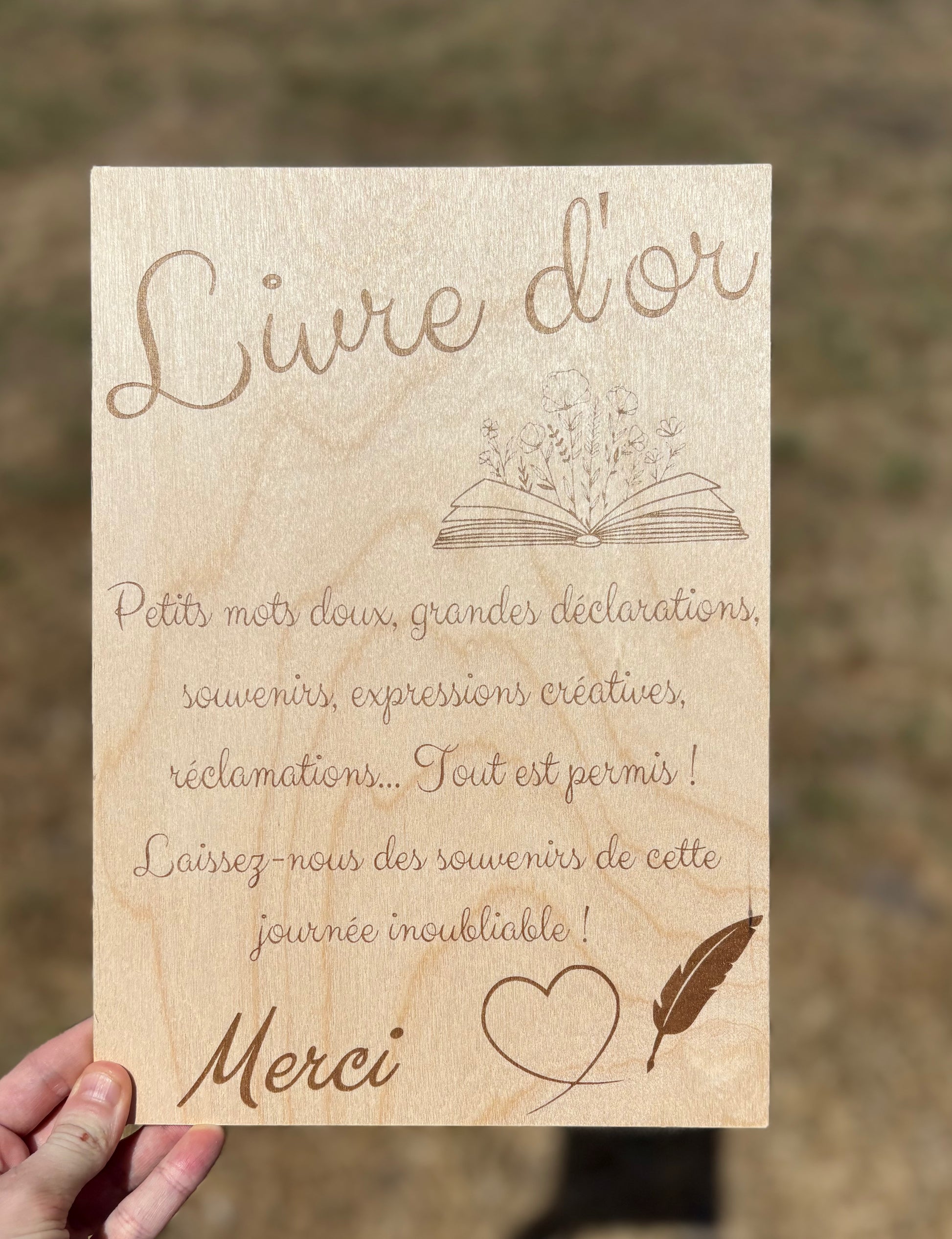 Affiche en bois au format A4, élégamment gravée pour ajouter une touche raffinée à votre livre d’or. Son bois naturel, avec ses veinures et sa chaleur authentique, donne du cachet à votre espace de souvenirs et invite vos convives à y laisser une trace de leur passage.