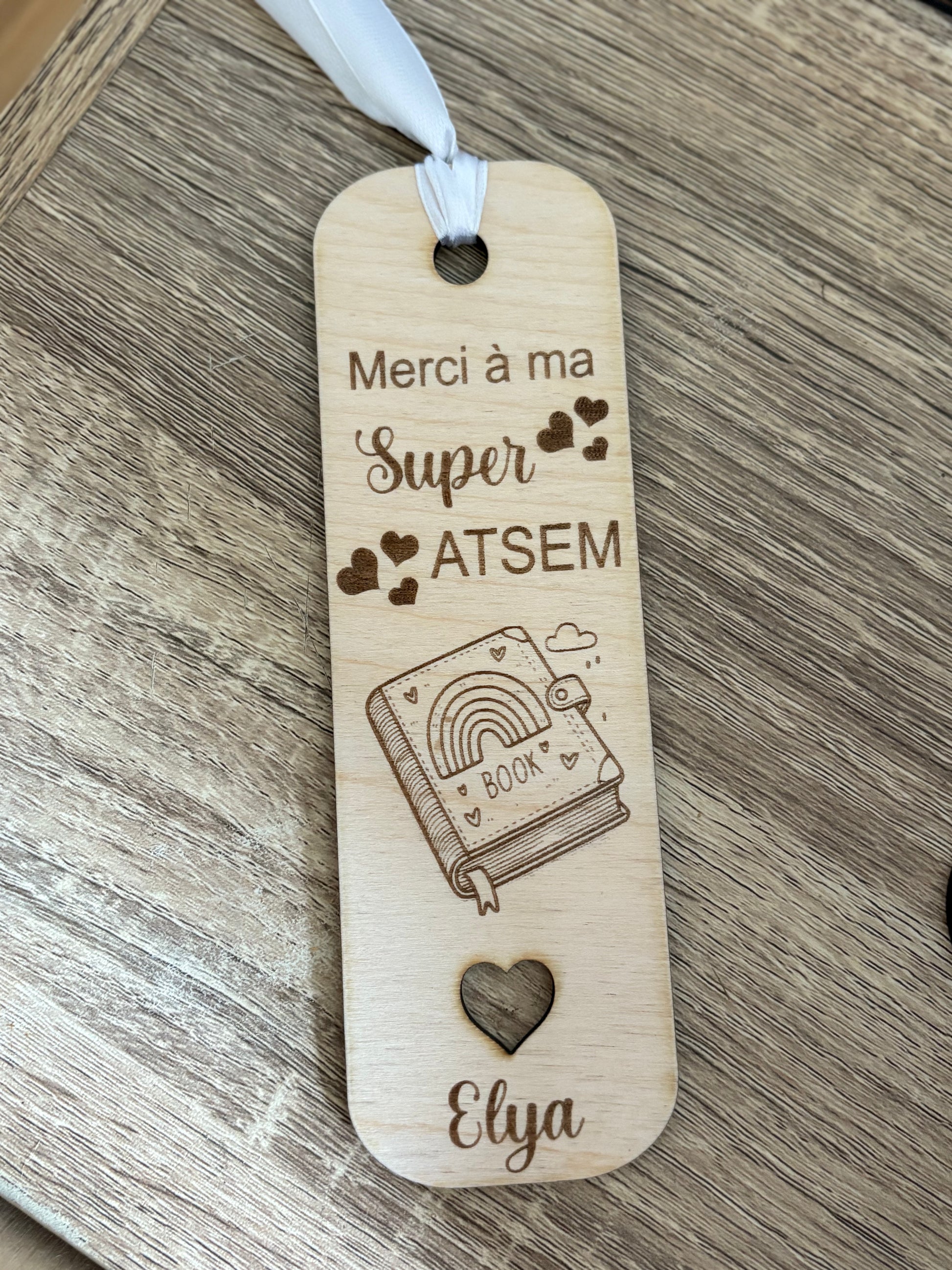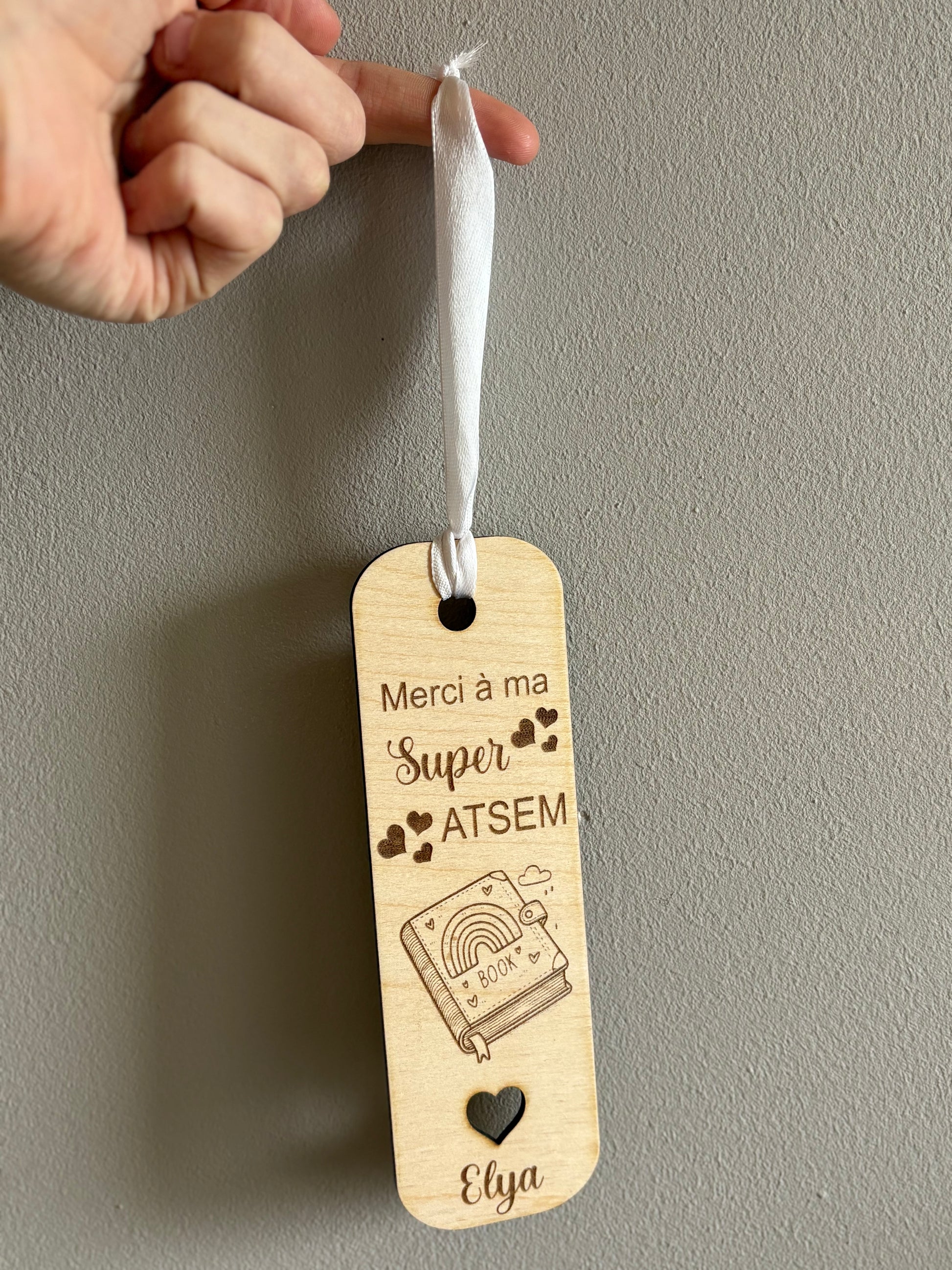 Un marque-page en bois de **17 cm par 5,3 cm** est une belle idée de cadeau de fin d'année pour une ATSEM ! 🎁