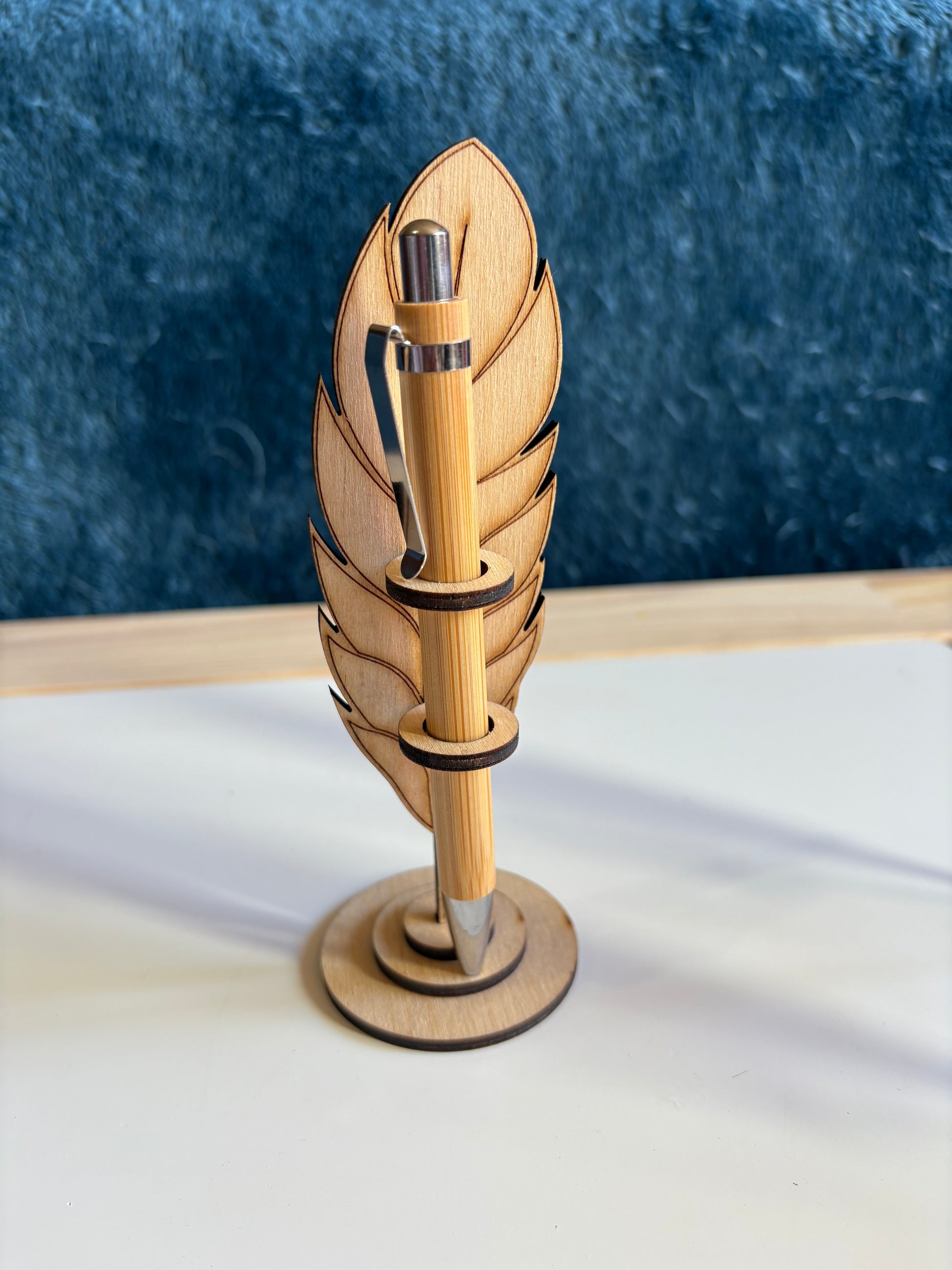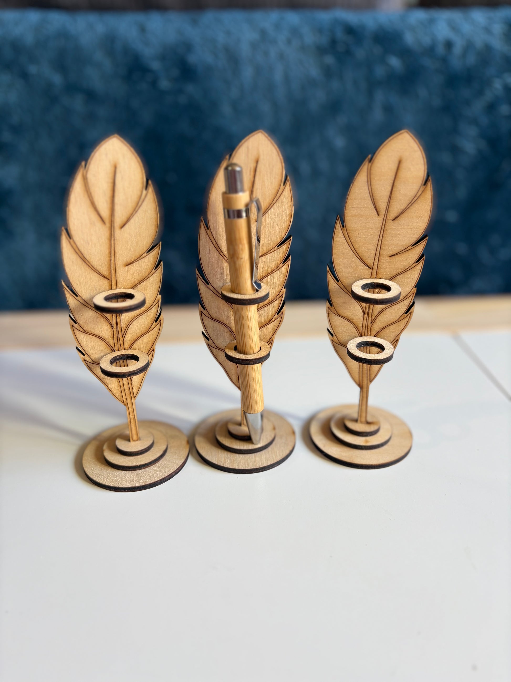 🪵 Porte-stylo en bois – Design plume, 16 cm