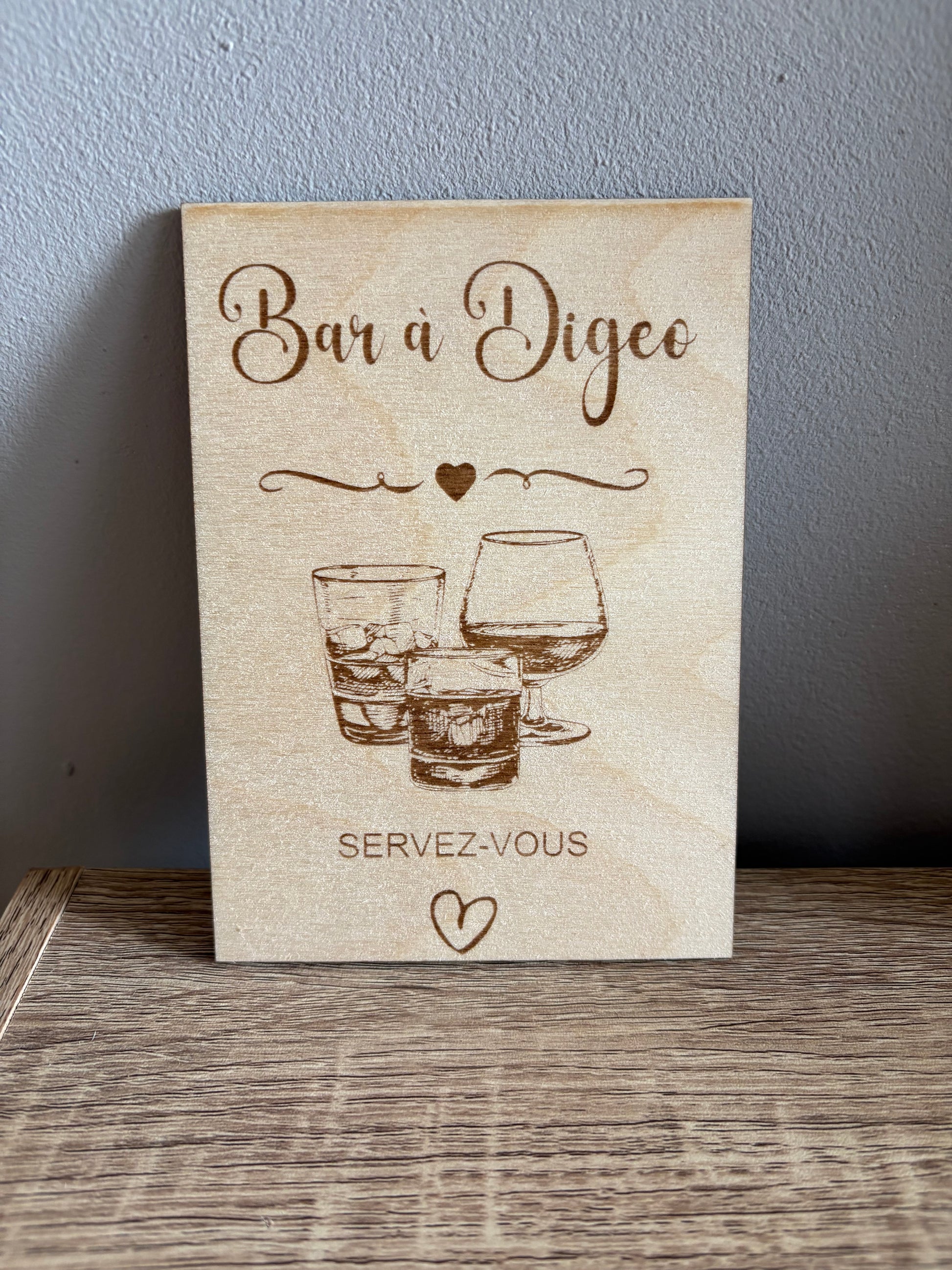 affiche en bois au format A6, parfaite pour guider vos invités vers le **bar à digestifs**, où ils pourront savourer leur liqueur favorite en toute convivialité !