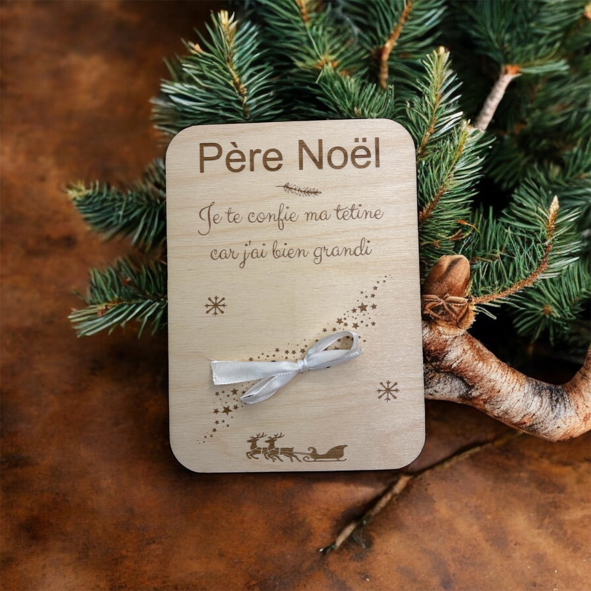 Cette charmante pancarte en bois, au format A5, apporte une touche chaleureuse et festive. Gravée d’un message tendre, elle invite les enfants à déposer leur tétine au Père Noël 🎅🏻, transformant ce petit geste en un moment magique et symbolique.